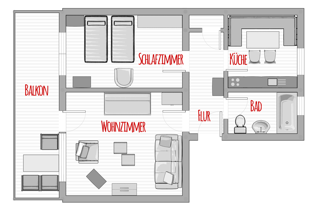 Bettwäsche, Hand- und Geschirrtücher, Spüllappen, Spülmittel, Flüssigseife, Toilettenpapier stehen Ihnen zur Verfügung. Auf dem Balkon befinden sich Balkonmöbel.